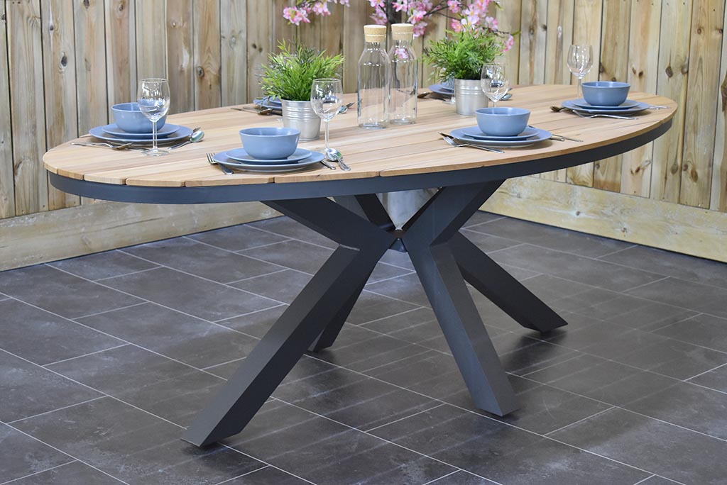 solider Gartentisch aus Teakholz und einem Aluminium-Untergestell in dunkelgraue Farbe.