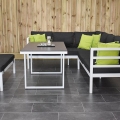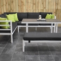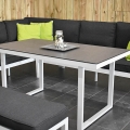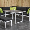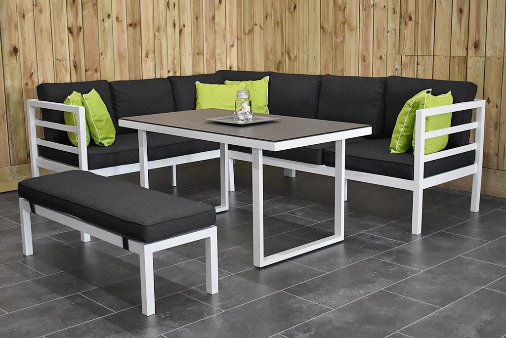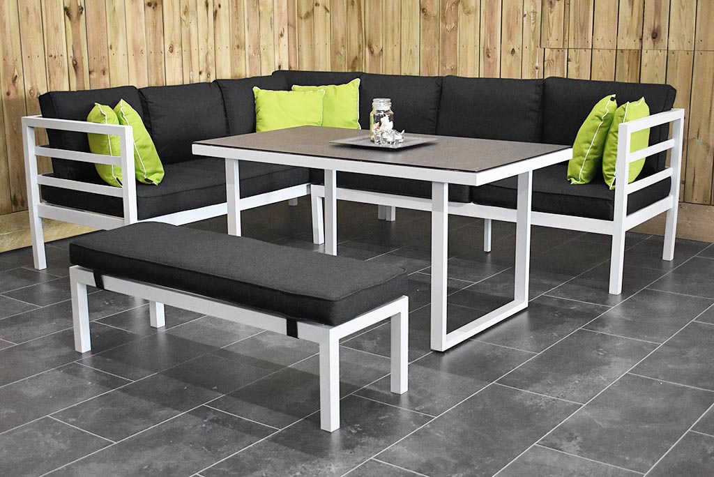 Toulouse Aluminium Dining Lounge Set Ecke mit Liegefunktion, Esstisch mit Keramik – Tischplatte und Bank, weiß