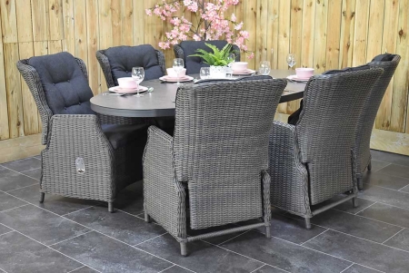 Material: Aluminiumgestell und Polyrattan (Polyethylen), halbrundes und rundes an den Arm- und Rückenlehnen Kunststoffgeflecht, Farbe: steingrau meliert