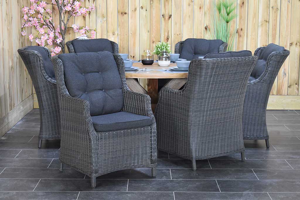 Material: Aluminiumgestell und Polyrattan (Polyethylen), halbrundes und rundes an den Arm- und Rückenlehnen Kunststoffgeflecht, Farbe: steingrau meliert